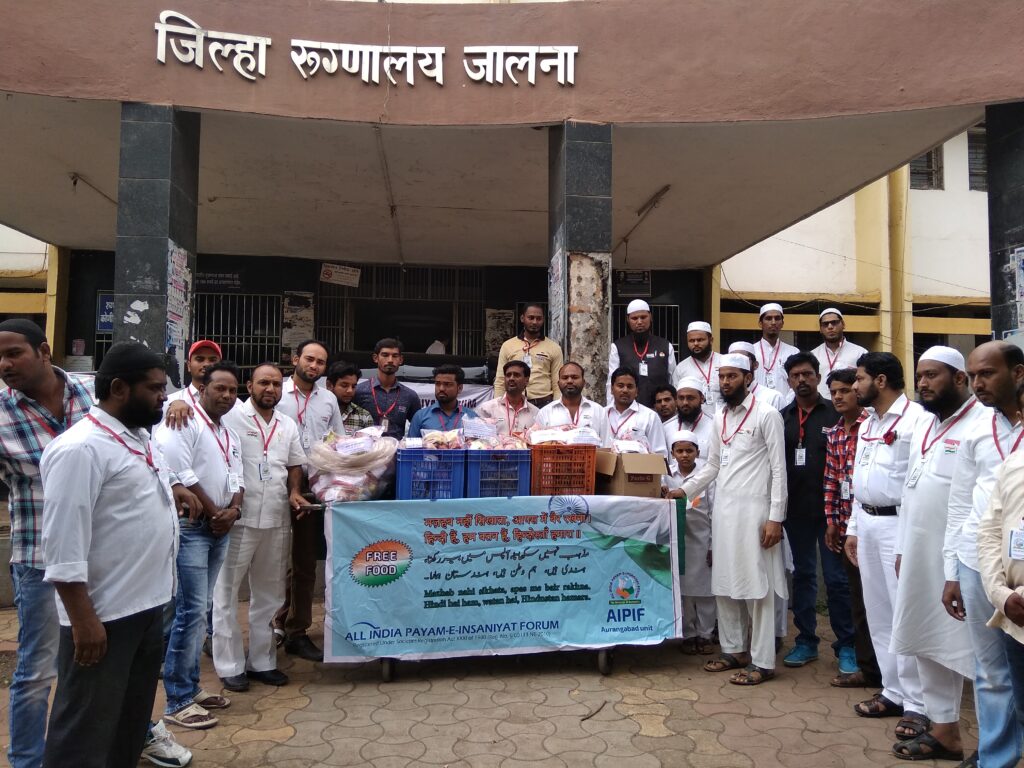 आज दीनांक 15/08/2018 को स्वतंत्रता दिवस के शुभ अवसर पर अखिल भारतीय मानवता का संदेश फोरम (ऑल इंडिया प्याम ए इंसानियत फोरम) जालना यूनिट की ओर से मौलाना अ.जबबार नदवी की सरपरस्ती में फोरम के वॉलंटियर्स द्वारा ज़िला चिकित्सालय (घाटी)जालना के समस्त वार्डों के भर्ती मरीज़ों में फल वितरण का पुनीत कार्यक्रम सम्पादित किया गया। इस फल वितरण कार्यक्रम के अंतर्गत अस्पताल के जनरल वार्ड, इमरजेंसी वार्ड, बच्चा वार्ड एवं महिला वार्ड आदि वार्डों में भर्ती मरीजों को फल वितरित कर उनकी तीमारदारी करते हुए इलाज के दौरान आवश्यक सहयोग प्रदान करने का विश्वास दिलाया गया।
