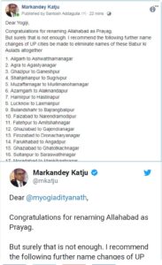 नई दिल्ली/मिल्लत टाइम्स: उत्तर प्रदेश में योगी आदित्यनाथ द्वारा इलाहबाद शहर का नाम बदलकर प्रयागराज करने के बाद अब सुप्रीम कोर्ट के पूर्व जस्टिस मार्कंडेय काटजू ने इलाहाबाद शहर का नाम बदलकर प्रयागराज करने के संबंध में टिप्पणी की है। जस्टिस काटजू ने फेसबुक पर पोस्ट लिखकर योगी आदित्यनाथ को सलाह दी है कि वह कुछ अन्य शहरों के नाम भी बदल दें। उन्होंने अपनी लिस्ट में उन शहरों के वर्तमान नामों की जगह वैकल्पिक नाम भी सुझाए हैं।