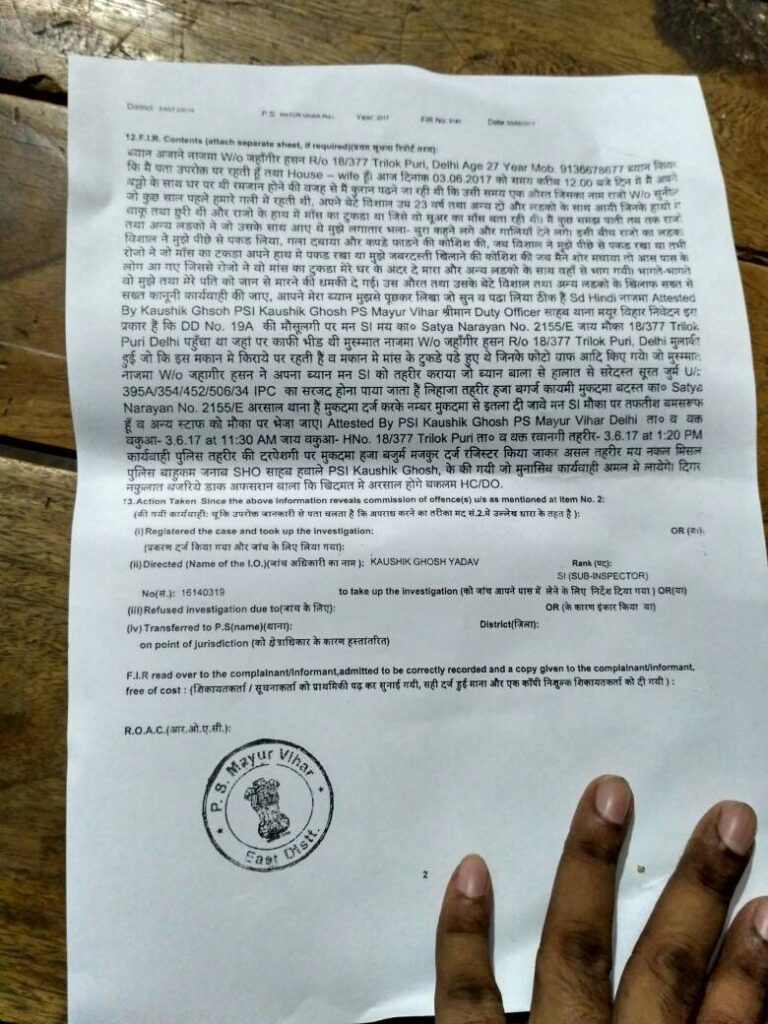 दिल्ली के त्रिलोकपुरी ब्लाॅक 18/377 मे रहने वाली नाजमा के घर पर कुछ गैर मुस्लिम समाज ने आकर उन पर हमला कर दिया हमला करने वाले के नाम राजो एवं उनके पुत्र विशाल के साथ दो लोग और थे दिनांक 03/06/2017 की घटना है पुलिस थाना मे दिए गए एफआईआर दर्ज के बयान के ममुताबिक नाजमा पति जहाॅगीर हसन का कहना है कि मै 12 बजे दिन मे अपने बच्चो के साथ घर पर थी मै कुरआन पढने जा रही थी तभी राजो नाम कि महिला अपने हाथ मे सुअर का मांस लिए और उसके साथी छुरी के साथ मेरे घर आई और मुझे गालीया देने उसके बाद उसका पुत्र विशाल मुझे पिछे से पकड़कर मेरा कपरा फारने लगा और राजो अपने हाथ का सुअर का मांस मुझे जबरदस्ती खिलाने लगी जब मैने शोर मचाया तब कुछ लोग दौरे तब उसने मांस को मेरे घर मे ही फेंक दिया और अपने साथी के साथ भागने लगी भागते भागते उसने मुझे और मेरे पति को मारने की धमकी दे गई बताया जाता है की राजो पहले उसी गली मे रहती थी जिस गली मे नाजमा रहती है