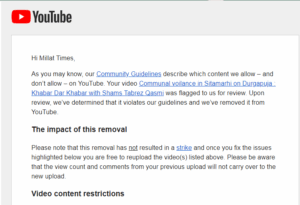 वीडियो हटाने के संबंध में यूट्यूब का मेल