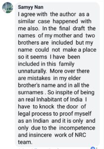 Samir with “Samyy Nan” nickname, on facebook from Assam comments: “In the final draft, the names of my mother and two brothers are included but my name could not make a place. So it seems I have been included in this family unnaturally. Moreover, there are mistakes in my elder brother’s name and in all the surnames. So in spite of being an real inhabitant of India, I have to knock the doors of legal process to prove myself as an Indian and it is only and only due to the incompetence and insincere work of NRC team.”