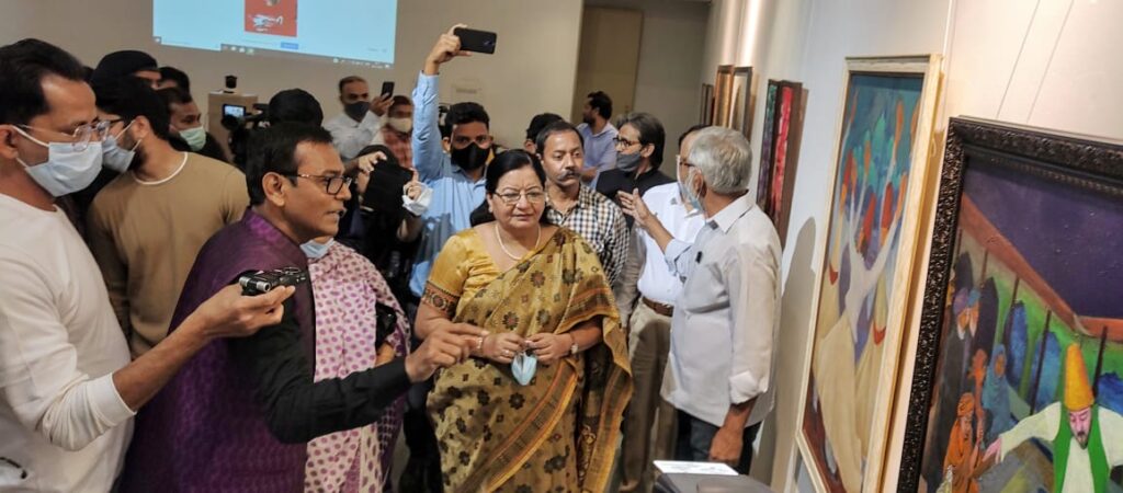 Chief Guest of the Group Show was Ms Anjoli Ila Menon. Mr Shah Abul Faiz besides coordinating this exhibition is showcasing his new series of paintings that display a sufi mystic exchange of ideas.. The series is a group of paintings on mystic poets, Rumi and Amir Khusro. The idea behind the painting is to carve “sama” dance of whirling dervishes besides the artist displaying a group of paintings portraying love and devotion  of  Amir Khusro-14th century courtier, poet, mystic and a spiritual disciple of Nizamuddin Auliya of Delhi.