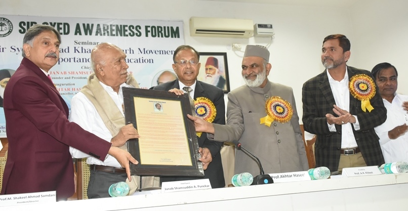 Sir Syed Awareness Forum (SAF) organized a national seminar on the topic “Sir Syed, Aligarh Movement and Importance of Education” at Auditorium, University Polytechnic, Aligarh Muslim University, Aligarh. Chief Guest of the seminar Mr. Shamsuddin Abdullah Punekar was conferred “Mohsin E Millat Award” for his services towards the nation and successfully establishing and running 24 educational institutions in Karnataka by Prof. Akhtar Haseeb, Pro Vice-Chancellor, AMU, and Prof. Shakeel Samdani, President, Sir Syed Awareness Forum, Aligarh.