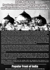 मिल्लत टाइम्स: 23 नवंबर, 2018 को पॉपुलर फ़्रंट ऑफ़ इंडिया की सेंट्रल सेक्रेटीरयट मीटिंग में ये फ़ैसला लिया गया कि पॉपुलर फ़्रंट ऑफ़ इंडिया (PFI) संघ परिवार, विश्व हिंदू परिषद, बीजेपी और दूसरे संगठनों के नेताओं पर कानूनी कार्रवाई करेगी क्योंकि ये लोग सुप्रीम कोर्ट की अवहेलना कर के राम मंदिर मुद्दे को फ़िर से अपने हाथों में ले रहे हैं और मुसलमानों के ख़िलाफ ज़हर उगलने और साजिश रचने का काम कर रहे हैं |