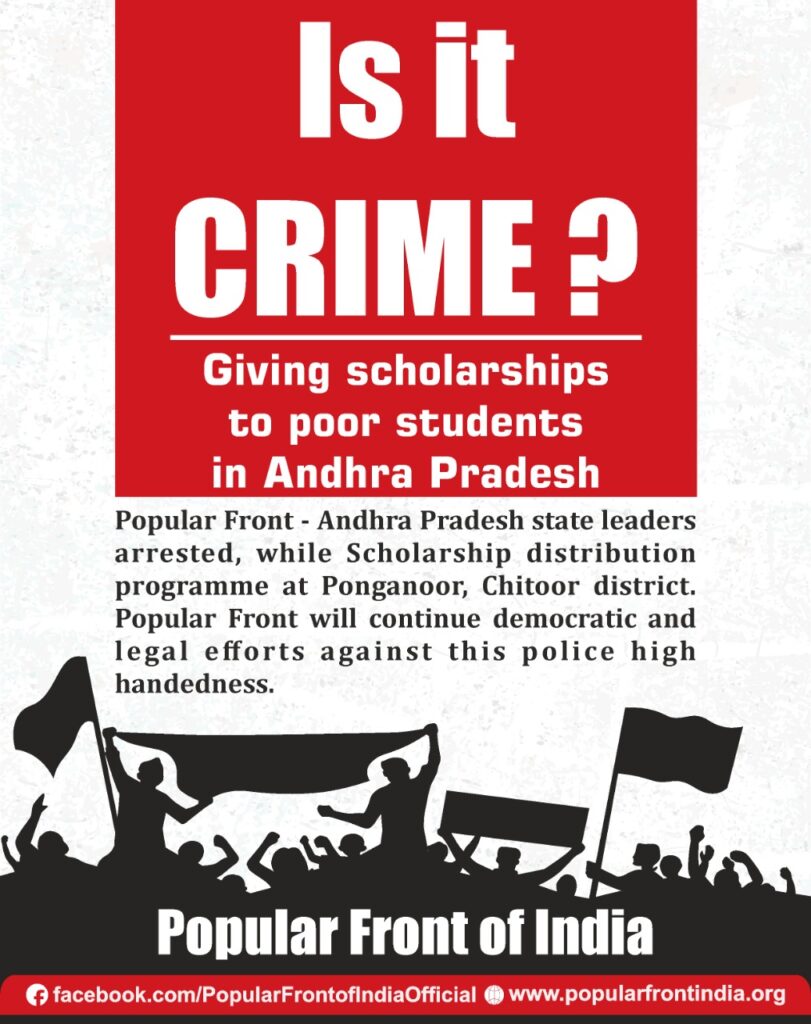 Press release,New Delhi: Popular Front of India General Secretary M Muhammed Ali Jinnah has strongly condemned the disturbances created by some police officers at a scholarship distribution programme in Andhra Pradesh organized by the Popular Front and the arbitrary unjust arrest and torture of its zonal secretary and district leaders on false charges. He demanded the Chief Minister of Andhra Pradesh Shri. Chandrababu Naidu to immediately intervene in this issue of minority rights violation in the state.