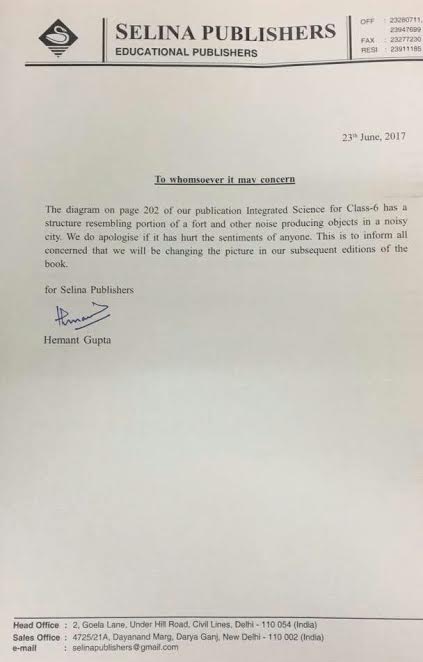 After bringing to  the notice of publisher about the hurting  presentation ,owner of Selina publication ,New Delhi Hemant Gupta admitted the mistake and  sent the apology today to all the concerns via email and assured to change the picture in the next edition.