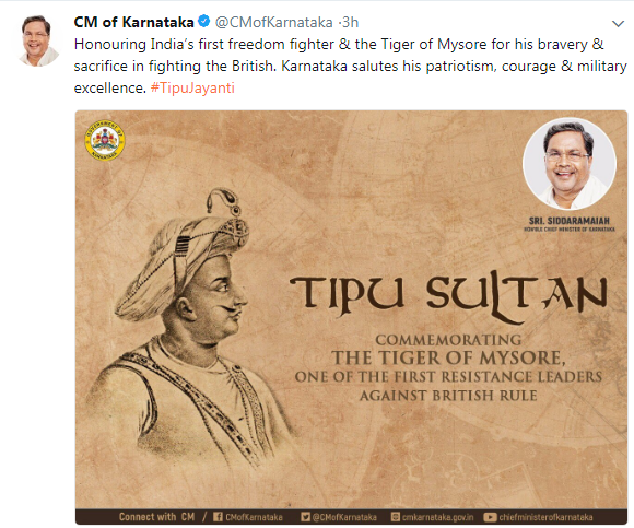 The Congress government in Karnataka is celebrating Tipu Jayanti on Friday amid tight security. The Siddaramaiah-led government in Karnataka has been celebrating the birth anniversary of the 18th century Mysore ruler for the past three years to honour him as a freedom fighter. Tipu Sultan died fighting the British. Right-wing Hindu groups are, however, opposed to the celebrations as they see Tipu Sultan as a barabaric ruler who carried out forceful conversions.