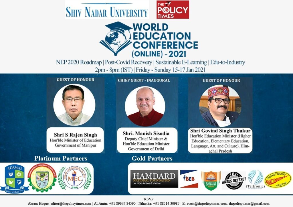 To deliberate on such issues, The Policy Times and Shiv Nadar University are jointly organizing a 3-Days virtual conference – the World Education Conference (WEC2021 online) between Friday, 15 January 2021and Sunday, 17 January 2021 from 2pm-8pm(IST) on Zoom. WEC2021 aims to bring the world’s educators ona single platform and discuss a new direction to education in 2021. The Conference will feature discussionson the Post-Covid recovery roadmap of education losses occurred in 2020, NEP 2020 implementation roadmap, Sustainable E-learning, and most importantly, education-industry integration.